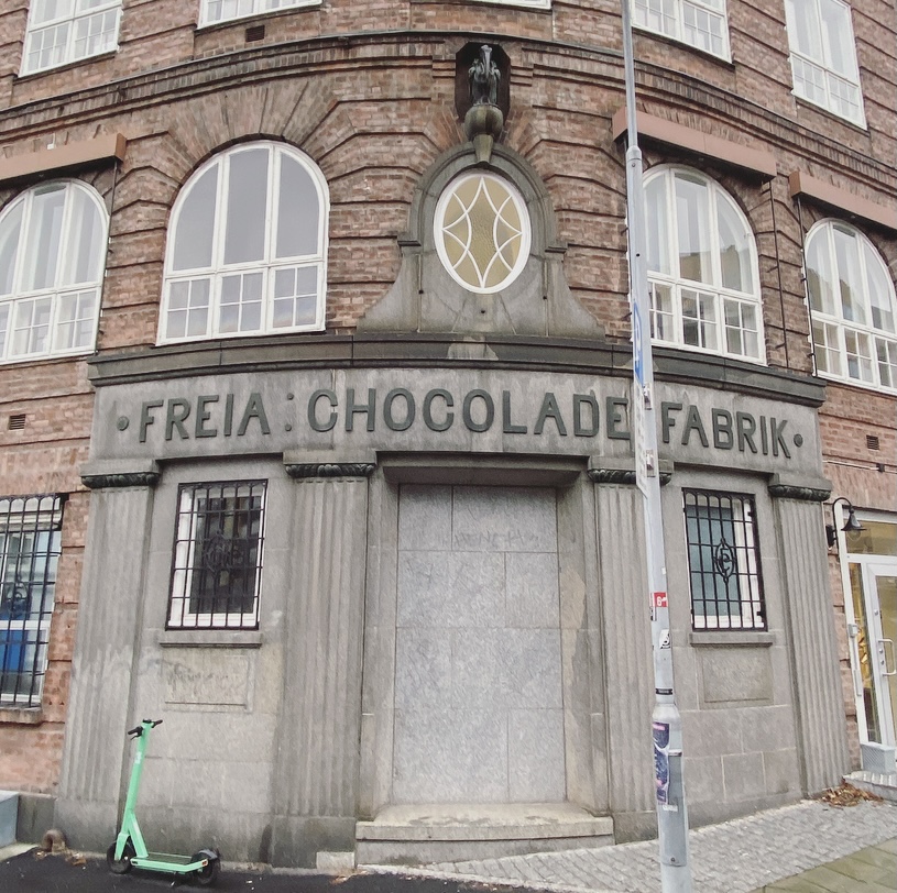 Etterhvert kan man svinge av mot høyre ned til Freia sjokoladefabrikk. Fabrikkområdet er historisk grunn, med både den fredede Freiasalen og Freiaparken. Av og til er det åpent og det er verdt en titt, men ring og sjekk at det er mulig å komme inn.