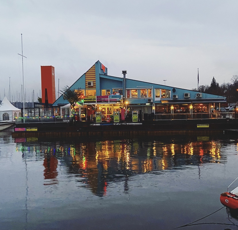 Nå har du kommet til Color Lines kai på Hjortnes. Her kan du fortsette langs stien som er merket Havnepromenaden (følg de oransje fargene). Den går egentlig fra Skøyen og helt til Bjørvika. Rett der gangbroen går ned, ligger Kongens marina. Dette er en salig blanding av spisesteder. Den ene halvdelen av bygget er tradisjonelle Frognerstranda kro. Den andre halvdelen (til venstre i bildet) er et mini-Miami med lysende flamingoer og palmer. Med andre ord er det umulig å bli skuffet, her kan man velge og vrake.